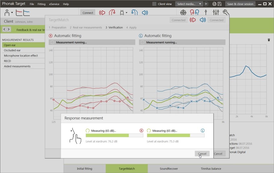 TargetMatch is an automated guidance system for real ear and Testbox measurements developed by Phonak in collaboration with Otometrics. It provides you with the benefits a seamless, step-by-step workflow, guiding you through the process of probe tube placement, obtaining Real Ear and 2cc/test box measurements and automatic or manual target matching. This creates an easy and effective way of incorporating verification into the fitting process.