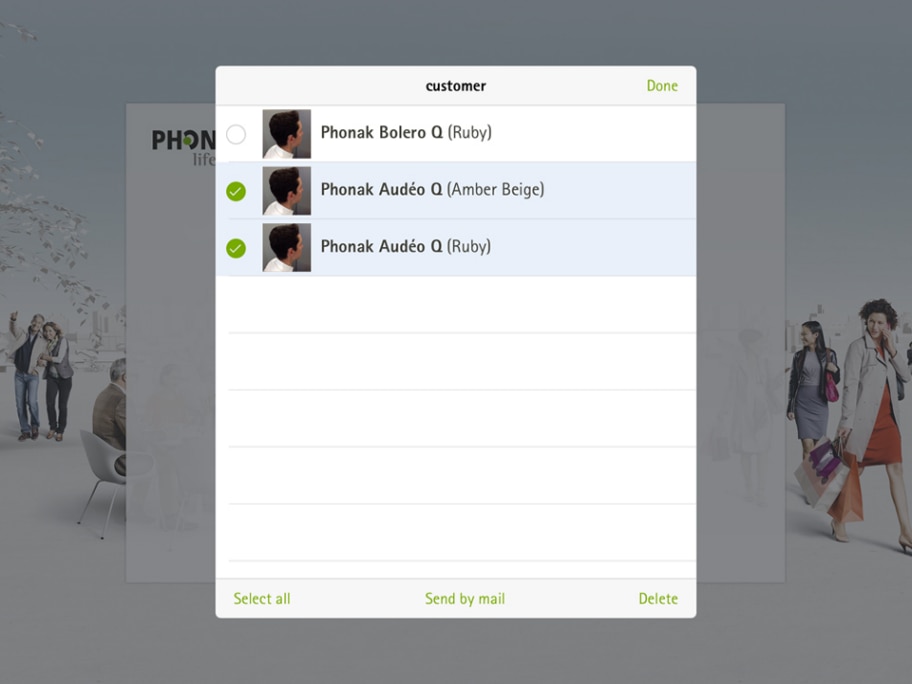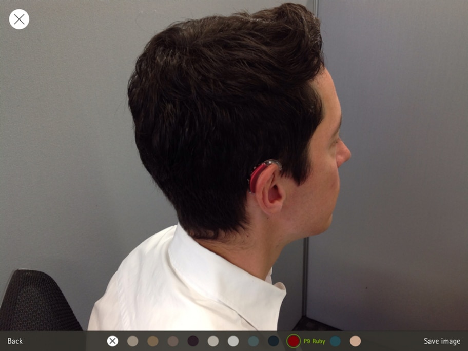 Con un iPad, el audioprotesista puede sacar fotografías de alta resolución de los usuarios que lleven un audífono. La aplicación permite al audioprotesista cambiar de manera virtual el color del audífono en función de la gama de colores disponible y mostrar cómo sería su aspecto en realidad.